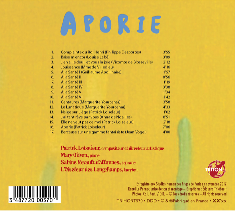 The World Premiere recording of 17 songs and duets for Baritone, Soprano and Piano by Patrick Loiseleur.