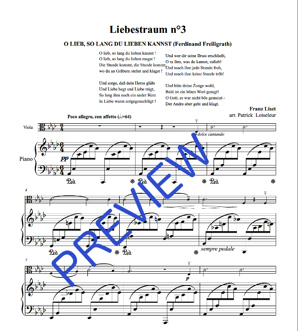 | Synopsis | This is a transcription for Viola and Piano of Franz Liszt's very famous Notturno n°3, which is itself baed on a lied for Soprano and Piano written on a poem by Ferdinand Frieligrath. The first verses could be translated like this: "O Love, as much as you can ! Oh love, as much as you want !". |