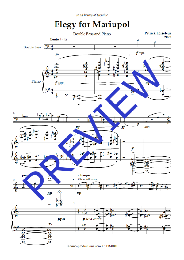 | Related scores | Elegy For Mariupol, for Double Bass and Orchestra (Loiseleur) |