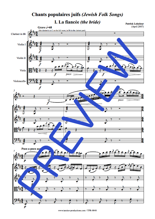 | Synopsis | Three pieces for Clarinet in Bb and String Quartet, in the style of jewish folk songs: