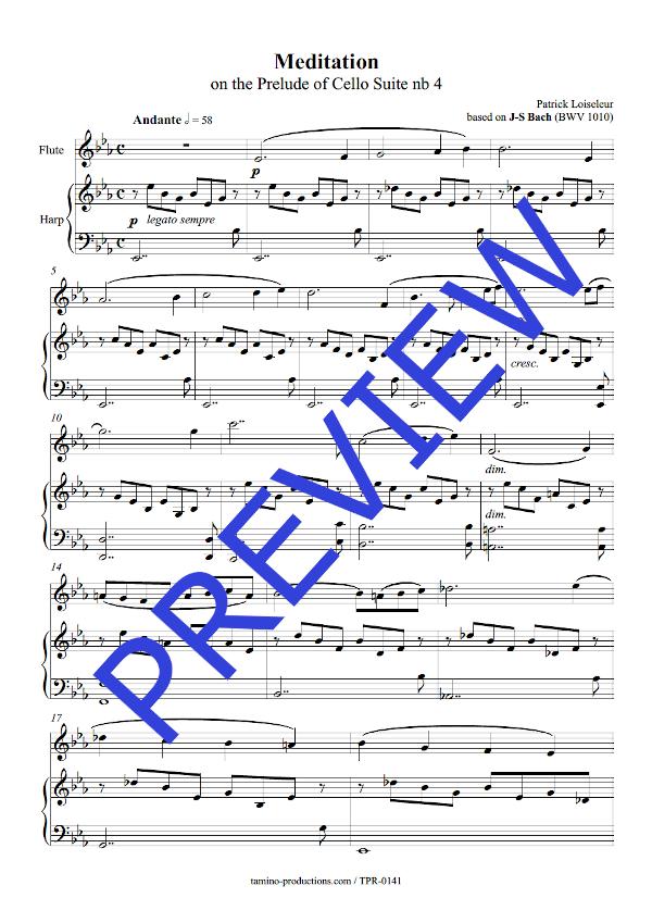 Bach's Prelude from the 4th Suite for Cello Solo forms the basis of the Harp part. The Flute part is a melodic line freely inspired by this timeless classic. |